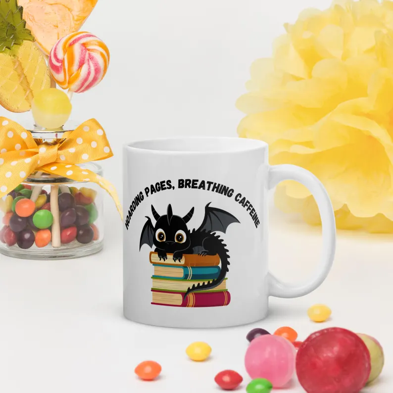 Calling all book dragons! 🐉 This funny bookish mug is perfect for readers who hoard pages and fuel their adventures with caffeine. Featuring the playful caption “Hoarding Pages, Breathing Caffeine” alongside a whimsical dragon lounging on a stack of books, it’s a hilarious gift for book lovers, bibliophiles, BookTok fans, and anyone who takes their reading (and coffee) seriously.