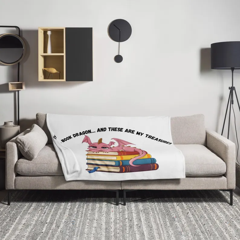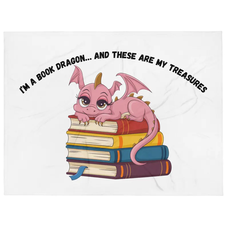 Embrace your inner book dragon! 🐉 This whimsical throw blanket features the playful caption “I’m a Book Dragon… and These Are My Treasures” alongside a cozy dragon lounging on a stack of books.