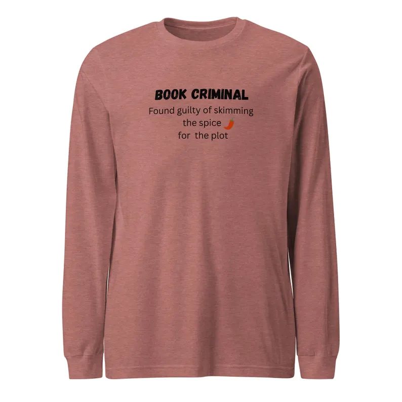 Show off your bookish sense of humor with this long-sleeved tee! Featuring the playful graphic “GUILTY (of skimming the spice for the plot)”, this shirt is perfect for book lovers, bibliophiles, and anyone who can’t resist a good story… or a little cheeky reading habit.